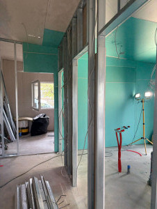 Beltéri burkolatok: Határoló falak és válaszfalak hangszigeteléssel ellátva, gipszkarton borítással. A