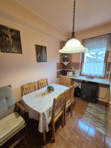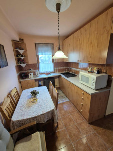 A konyha-étkező egyedi fenyőbútorzata otthonos és barátságos hangulatot teremt, míg a közlekedőben lévő beépített szekrény bőséges tárolóhelyet kínál.